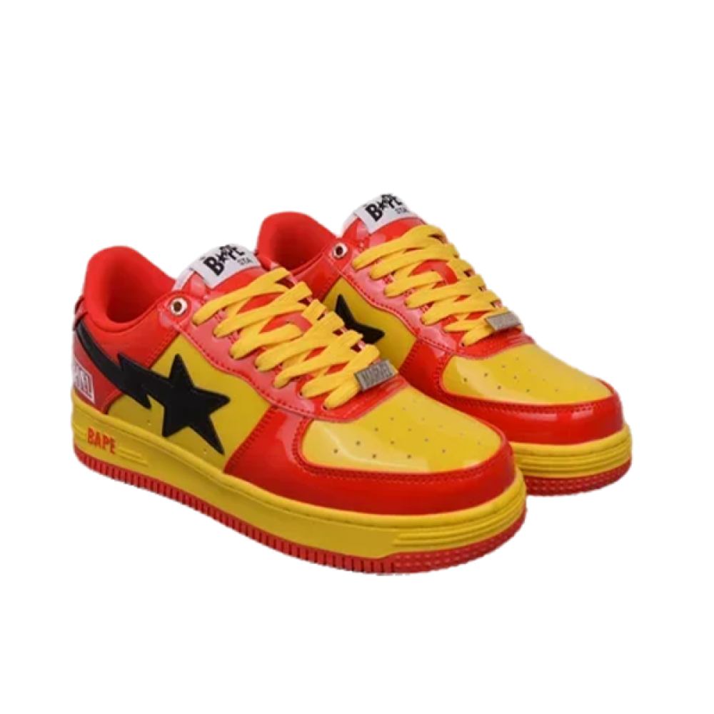 إطلالة شبابية وجريئة مع سنيكر Marvel × BAPE للجنسين بلون أحمر وأصفر، تصميم يجمع بين روح الكوميكس والأناقة العصرية لعشاق المغامرات والستايل المميز.