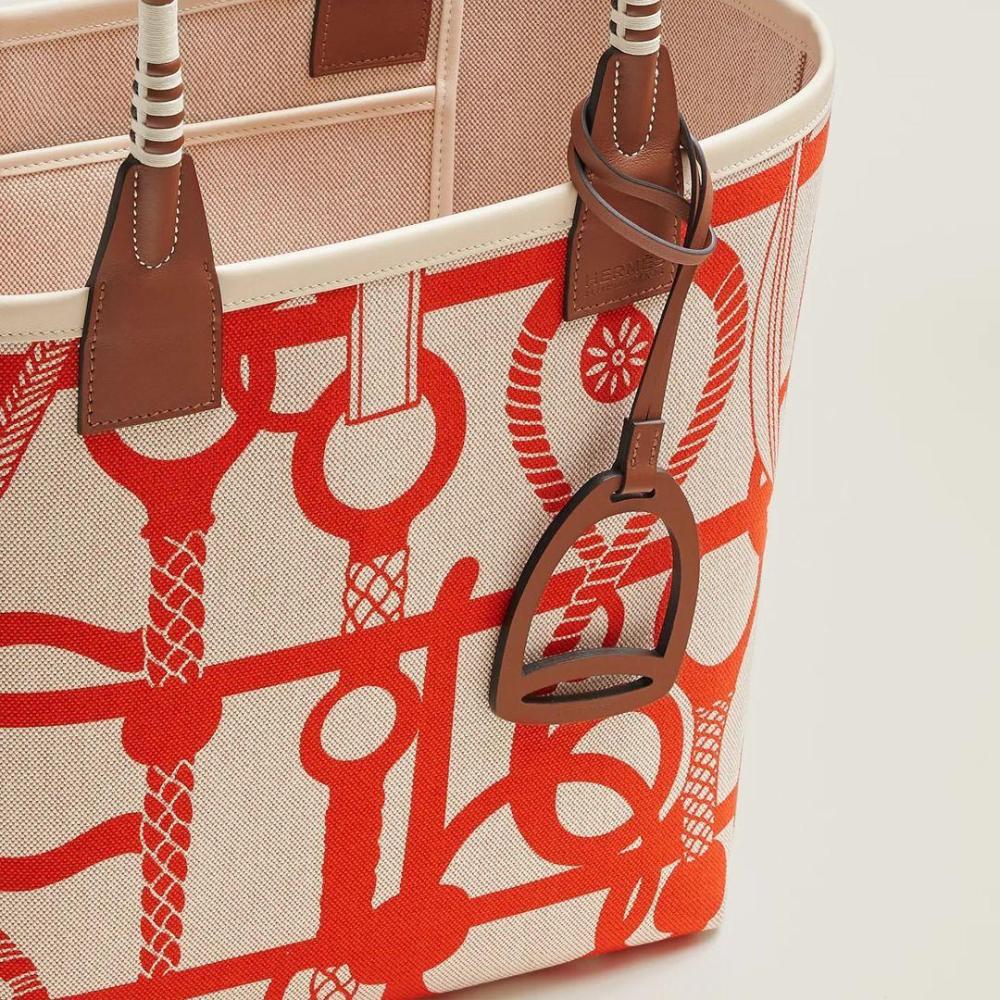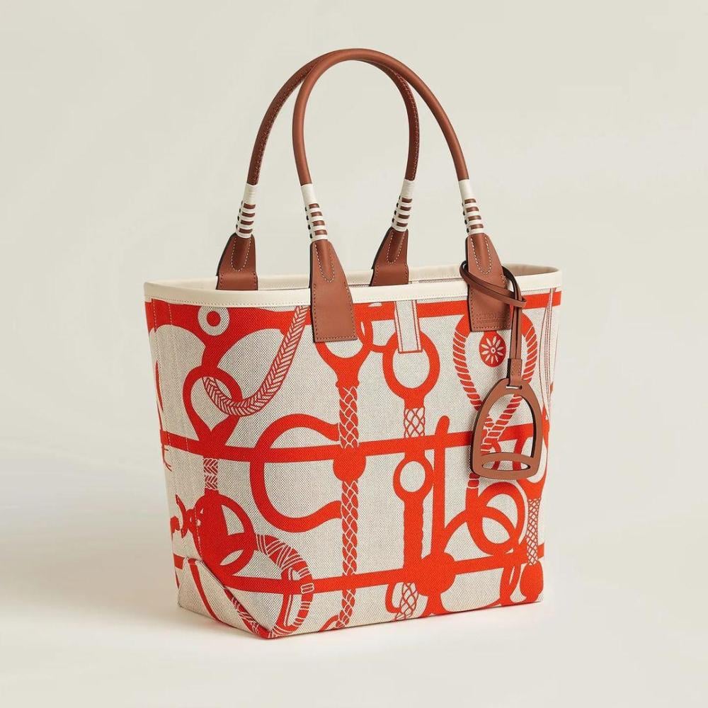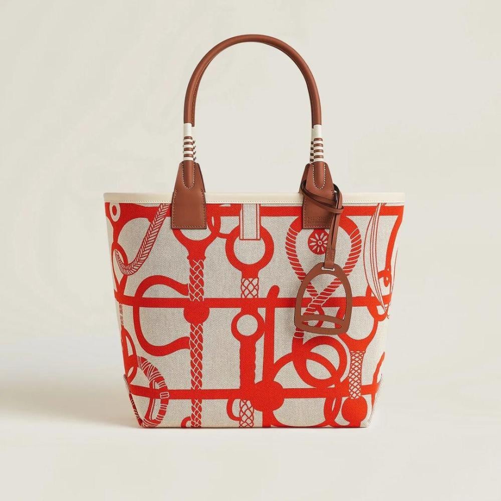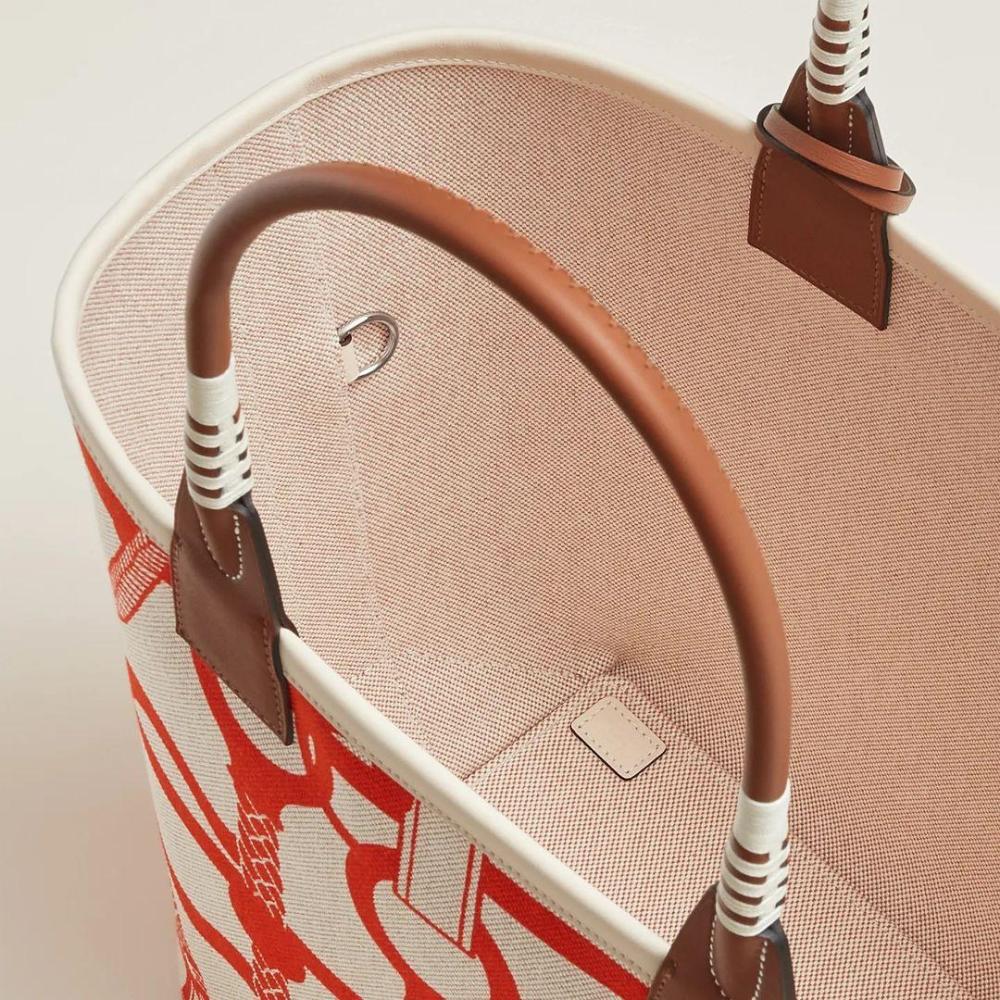 الفخامة والتميّز مع حقيبة هيرمز Steeple بلون البيج الأنيق، المزينة بنقوش أورانج مميزة التي تضفي لمسة حيوية على التصميم. مع مقبض بني يضيف لمسة من التباين، هذه الحقيبة تجمع بين الأناقة والعملية.