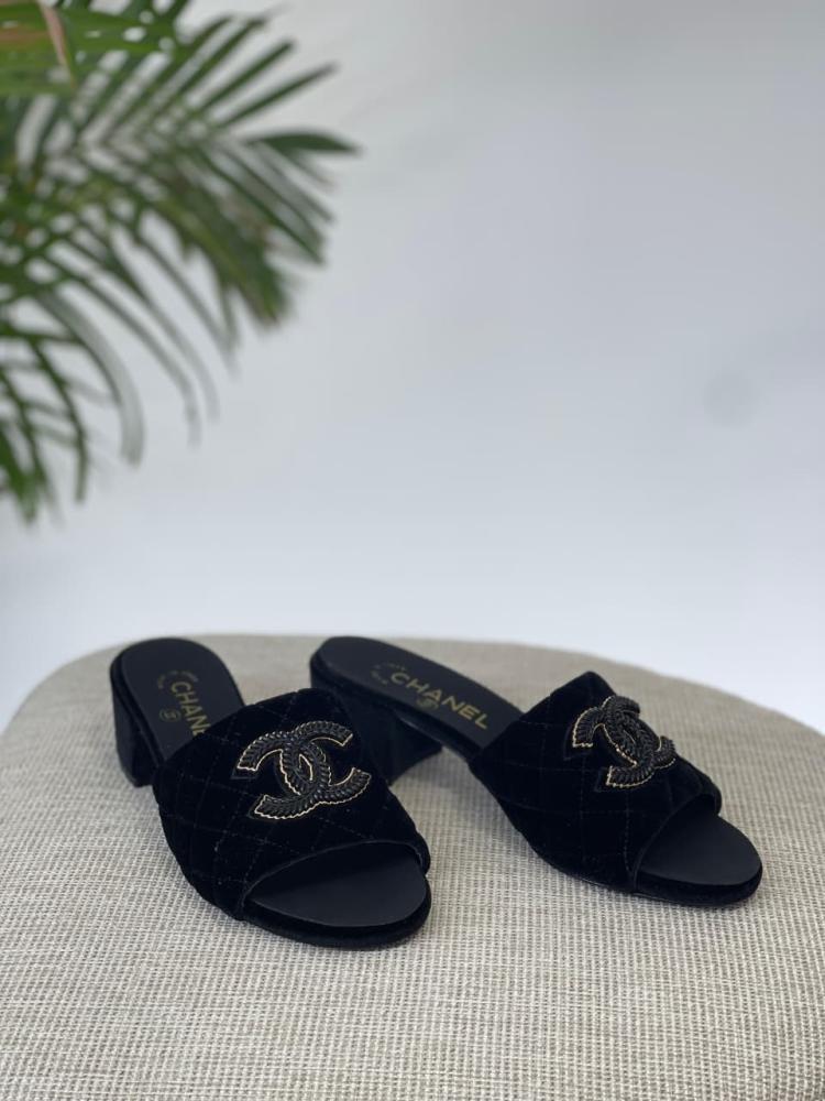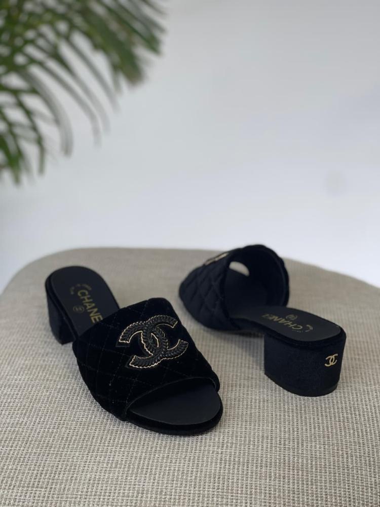 شبشب مخملي شانيل بكعب منخفض مربع لون أسود