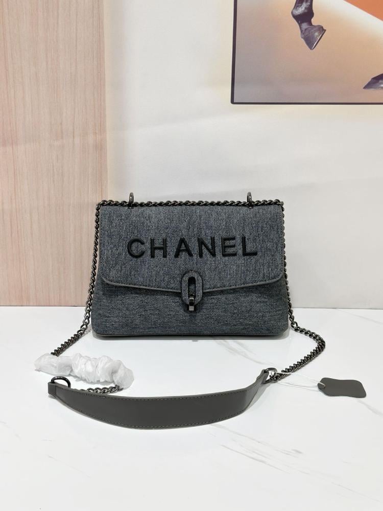 حقيبة قماش قلاب شانيل مع سلسلة بلون رمادي داكن