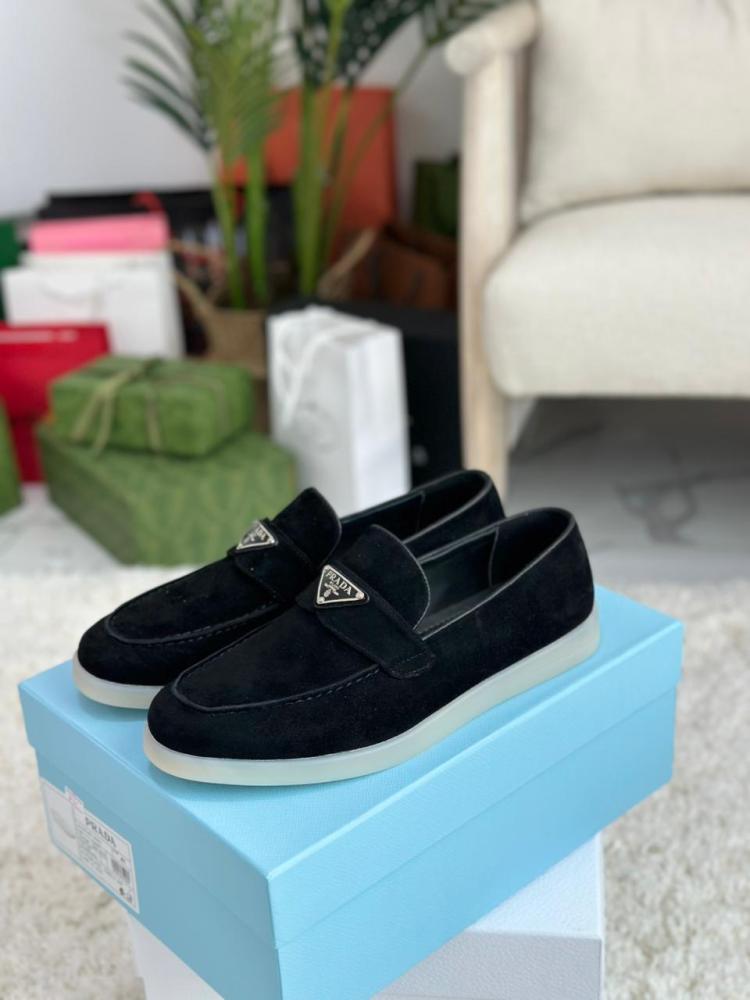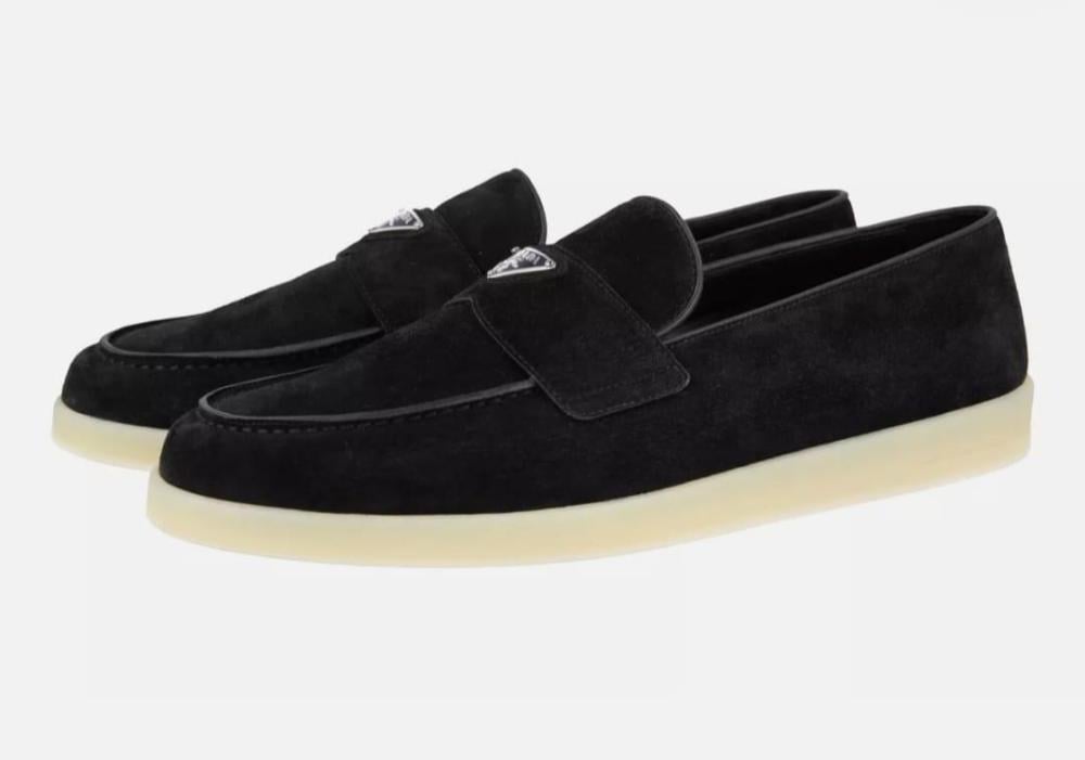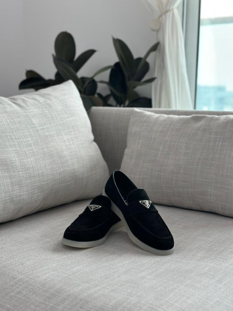 لوفرز برادا الرجالي المسطح بلونه الأسود الأنيق. تصميم فلات فاخر يجمع بين البساطة والفخامة