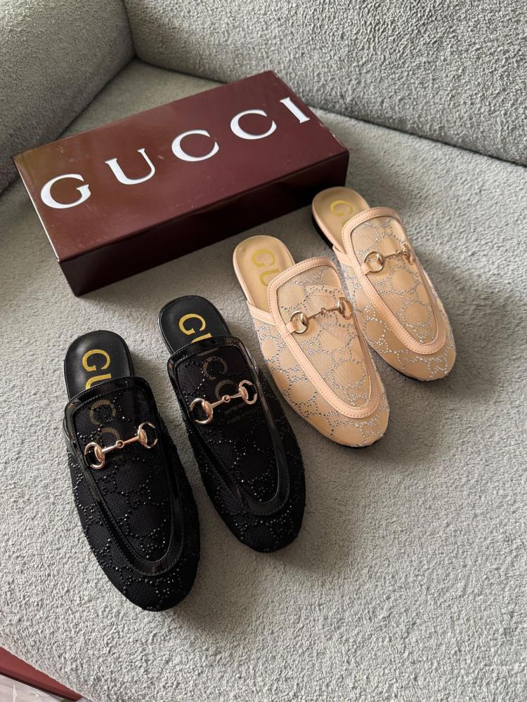 سليبر قوتشي النسائي المفتوح من الخلف بلون أسود أنيق، مزخرف بستراس يلمع ويبرز أناقتك في كل خطوة.