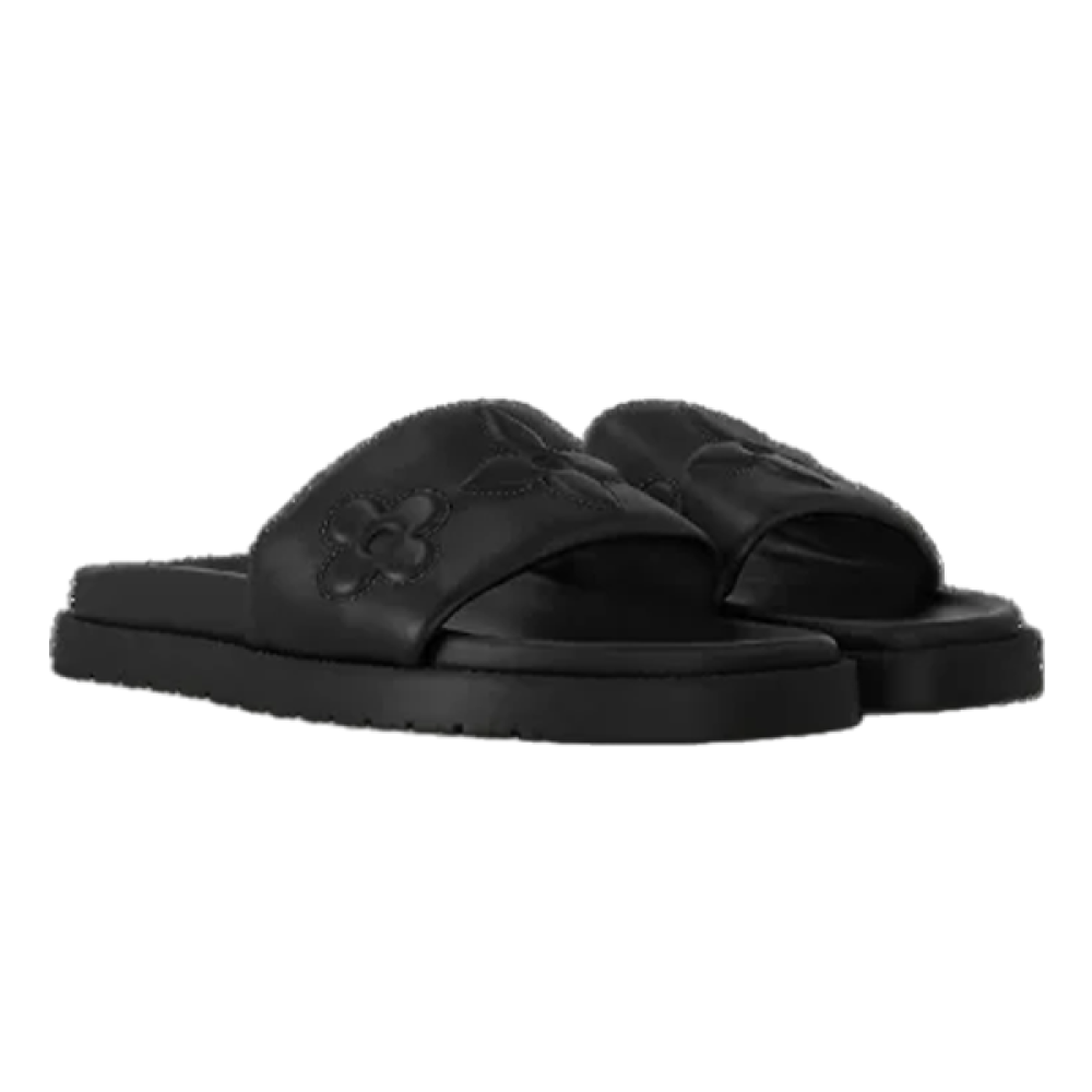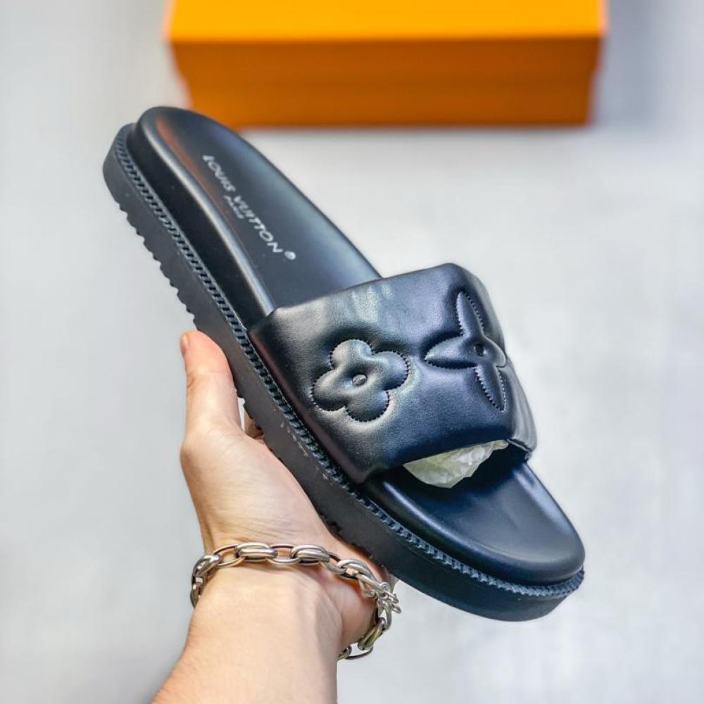 سليبر لويس فيتون باللون الأسود مع نقشة المونوغرام الشهيرة، يجمع بين التصميم العصري واللمسة الكلاسيكية الفاخرة ليمنحك إطلالة أنيقة ومريحة سواء بالمنزل أو في الطلعات الكاجوال.