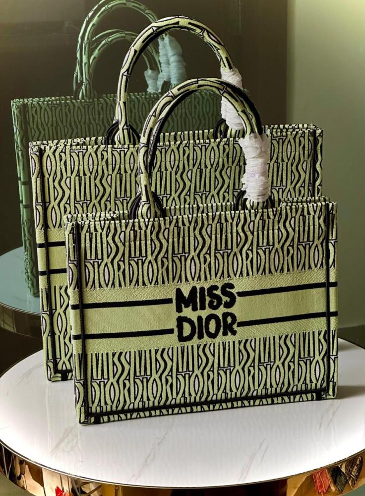 أضيفي لمسة من الأناقة العصرية إلى إطلالتك مع توت باق ديور الفاخر. يتميز هذا الحقيبة بتصميمها الجريء الذي يجمع بين اللون الأخضر الليموني والأسود، مما يجعلها قطعة فريدة تلفت الأنظار. الحقيبة الكبيرة مزينة بنمط مائل يحمل كلمة “DIOR”، بينما الحقيبة الصغيرة تتألق بخطوط أفقية وكلمة “MISS DIOR” في المنتصف.
