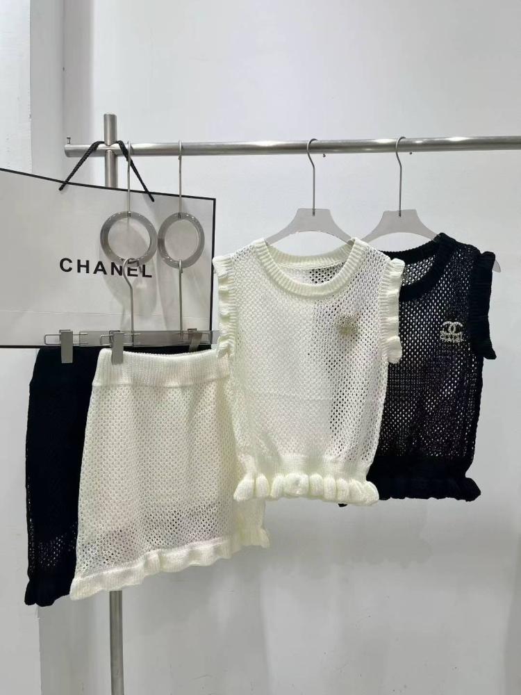 سيت شانيل تنورة وبلوزة بنمط شبكي مفرغ لون أسود