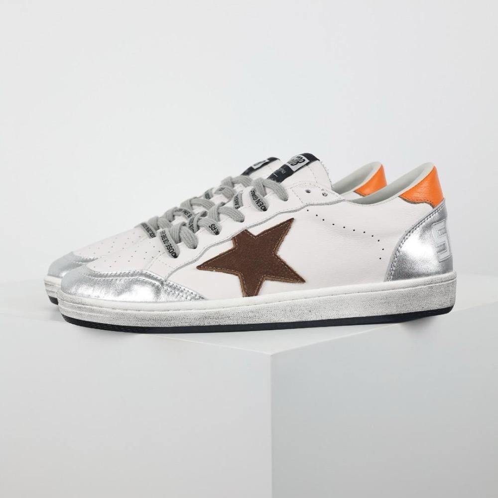 لمسة أنيقة وعصرية مع شوز فلات جولدن غوس بول ستار أبيض وفضي مع بني، تصميم يجمع بين الراحة والفخامة بأسلوب كاجوال راقي