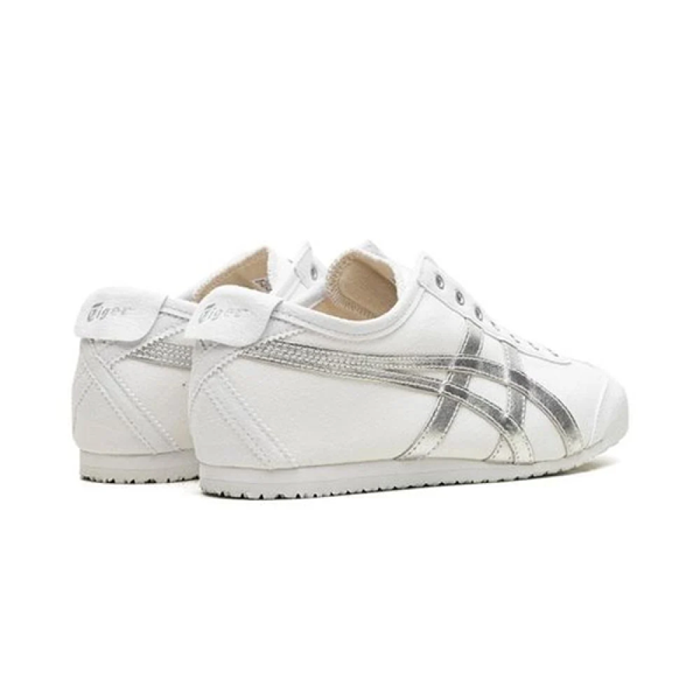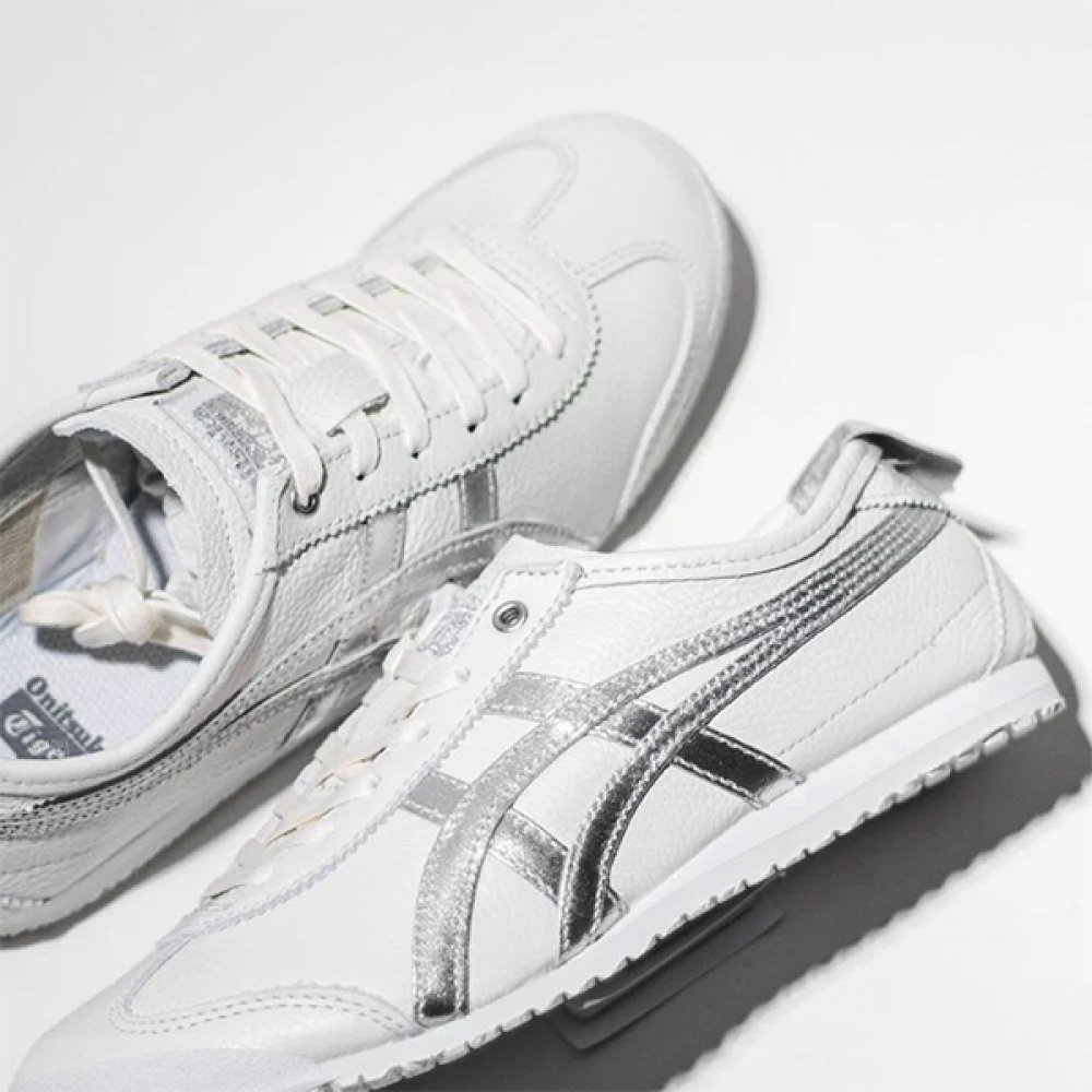 حذاء أونيتسوكا تايجر ميكسيكو66 بالأبيض الكلاسيكي مع لمسات فضية لامعة تعطيه جاذبية تلفت الأنظار.
