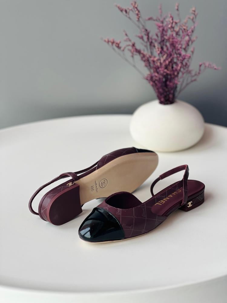 حذاء بحزام خلفي للنساء شانيل جلد بلون برغندي واسود