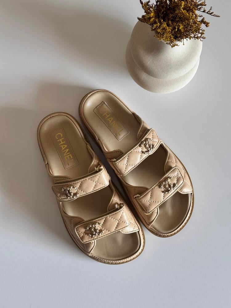 شبشب شانيل صندل فلات نسائي بلون بيج يجمع بين البساطة والفخامة بأسلوب يناسب الإطلالات اليومية والمناسبات الأنيقة.