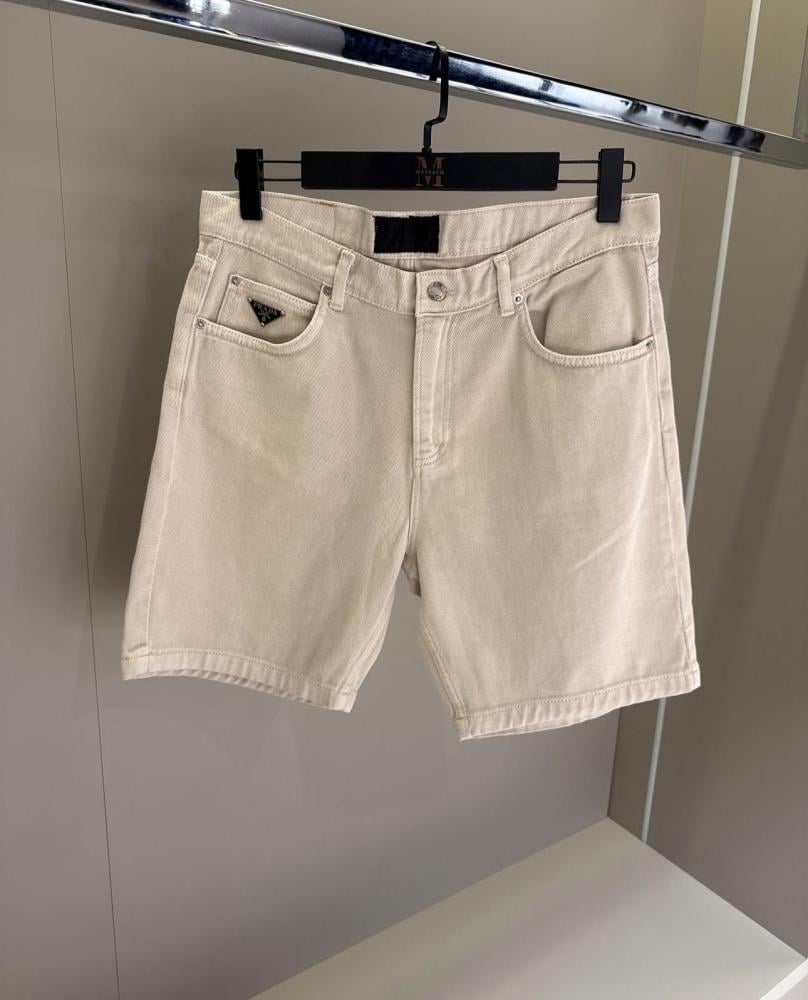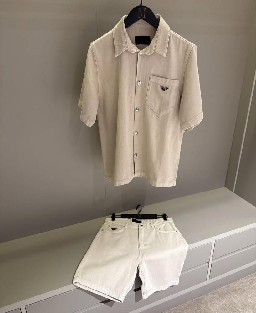 طقم دينيم رجالي من برادا يتكوّن من شورت وقميص بلون بيج أنيق، تصميم يجمع بين الراحة واللمسة الفاخرة بأسلوب كاجوال راقي.