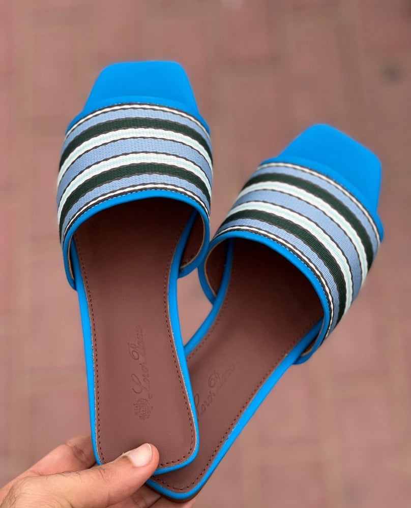 سليبر فلات فاخر للنساء من لوروبيانا بلون أزرق يمثل قطعة أنيقة ومريحة في آن واحد، مما يجعلها خيارًا مثاليًا للنساء اللواتي يقدرن الراحة والأناقة في الأحذية.