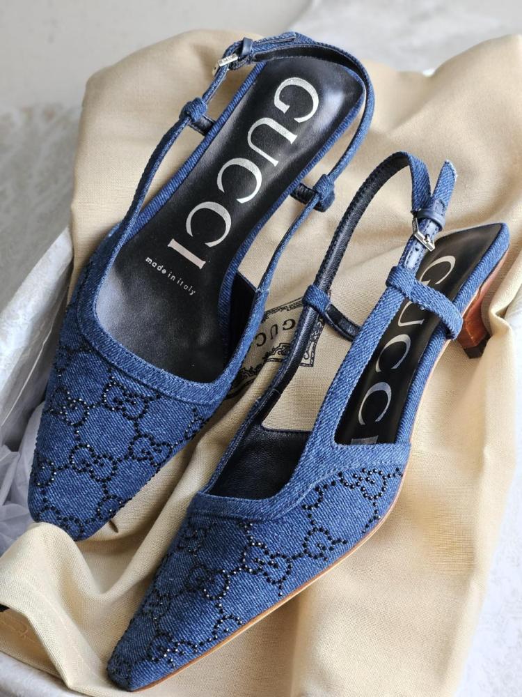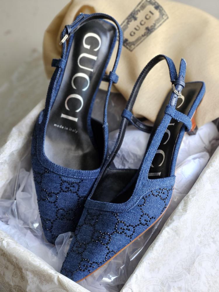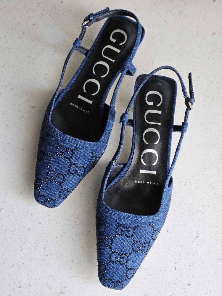 صندل بحزام خلفي وكعب منخفض من جوتشي بتصميم دينيم أزرق مع تفاصيل ستراس اللامعة.