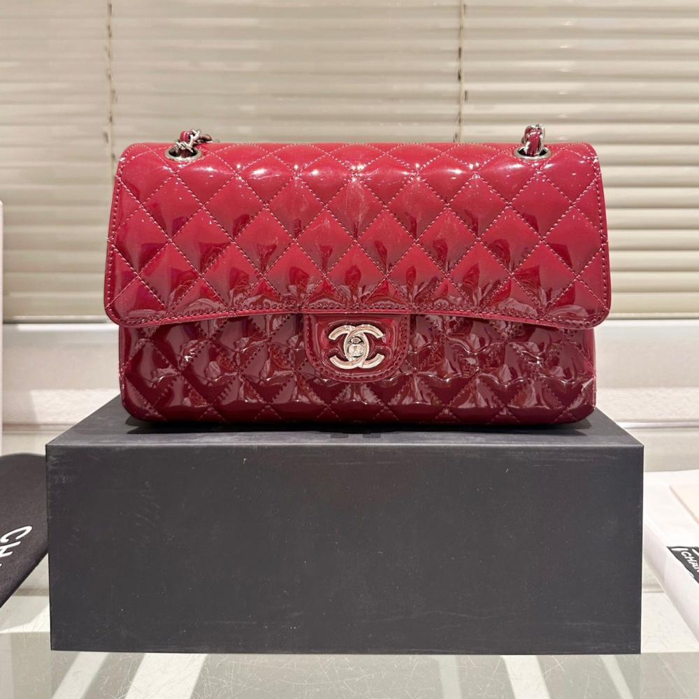 حقيبة شانيل جلد لامع عصرية بحامل سلسلة أحمر وفضي