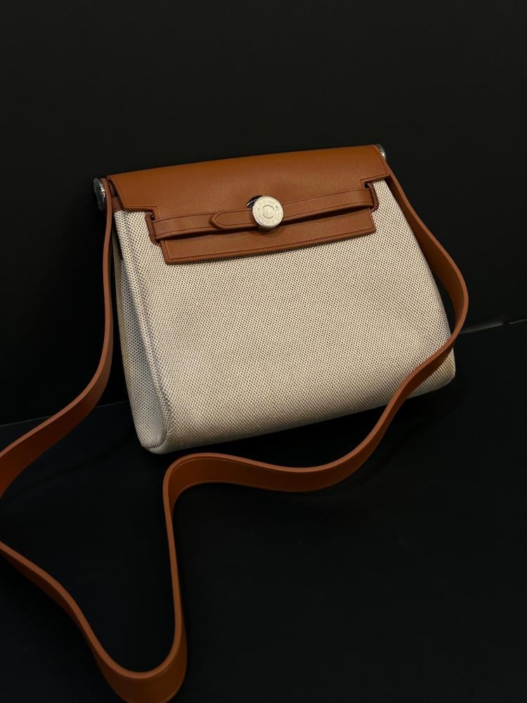 حقيبة قماش مع جلد هيرمس هيرباق 20سم لون بيج وكراميل