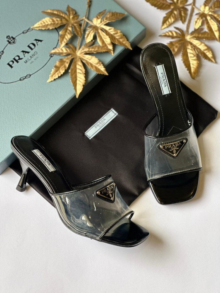حذاء برادا نسائي كعب رفيع أسود شفاف شعار ذهبي