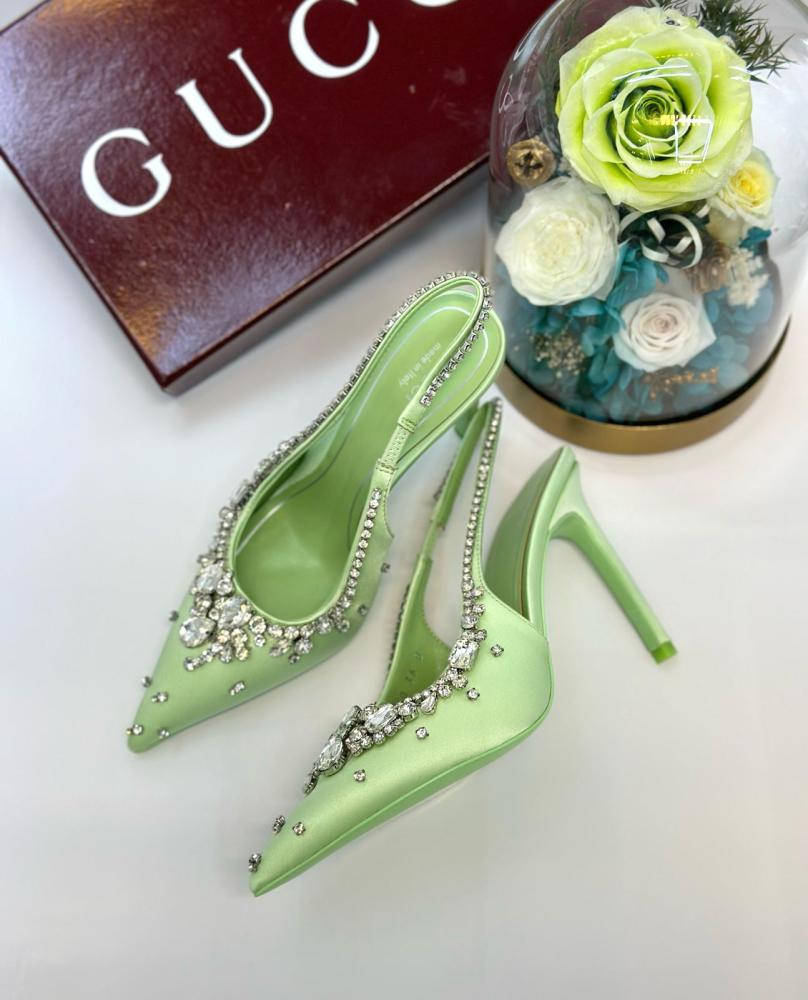 صندل ساتان بحزام خلفي قوتشي كعب عالي مرصع أخضر كيوي