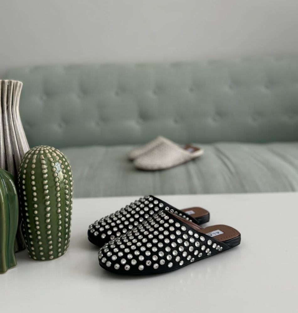 تألقي بإطلالة ساحرة وأنيقة مع حذاء الفلات المغلق من الايا، المصنوع من الجلد الطبيعي الفاخر باللون الأسود الكلاسيكي. يتميز هذا الحذاء بتصميمه العصري الجذاب مع لمسة من اللمعان البراق، بفضل تزيينه بفصوص من أحجار الراين اللامعة على مقدمة الحذاء.