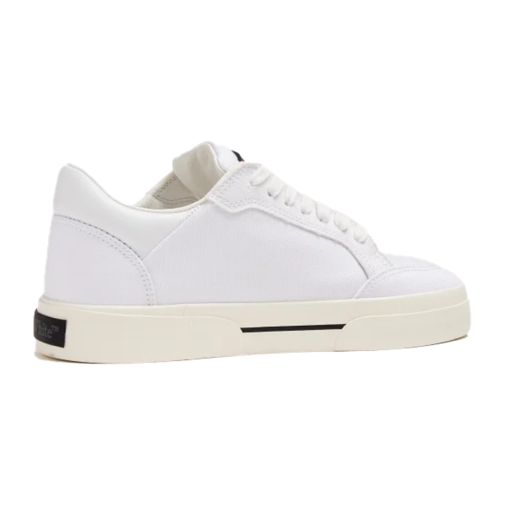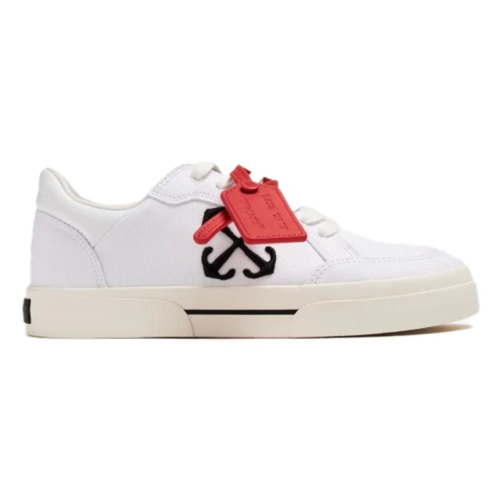 اكتشف الأناقة العصرية والراحة الفائقة مع سنيكرز أوف وايت نيو فولكانايزد للجنسين باللون الأبيض والشعار الأسود.