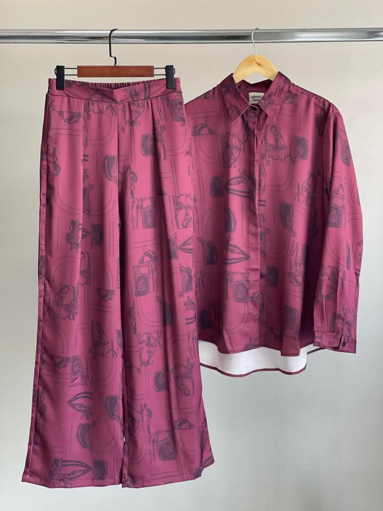 تراكسوت هيرميز نسائي عريض بلون عنابي يجمع بين الراحة والستايل الراقي بتصميم مكوّن من بنطال وقميص بقصة واسعة ولمسة فاخرة تليق بالإطلالة اليومية أو الكاجوال الراقية.
