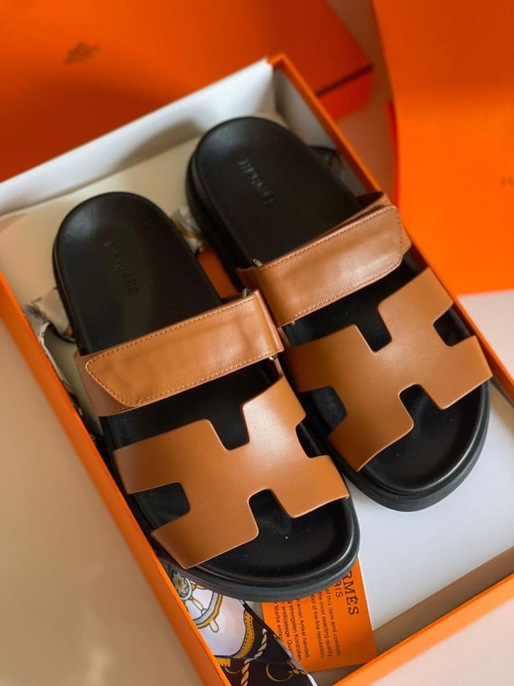 تعرفي على الفخامة والأناقة الاستثنائية مع سليبر جلد فلات للنساء من Hermes، المصمم بشكل شايبر فاخر بلون كراميل وجودة سوبر ماستر: