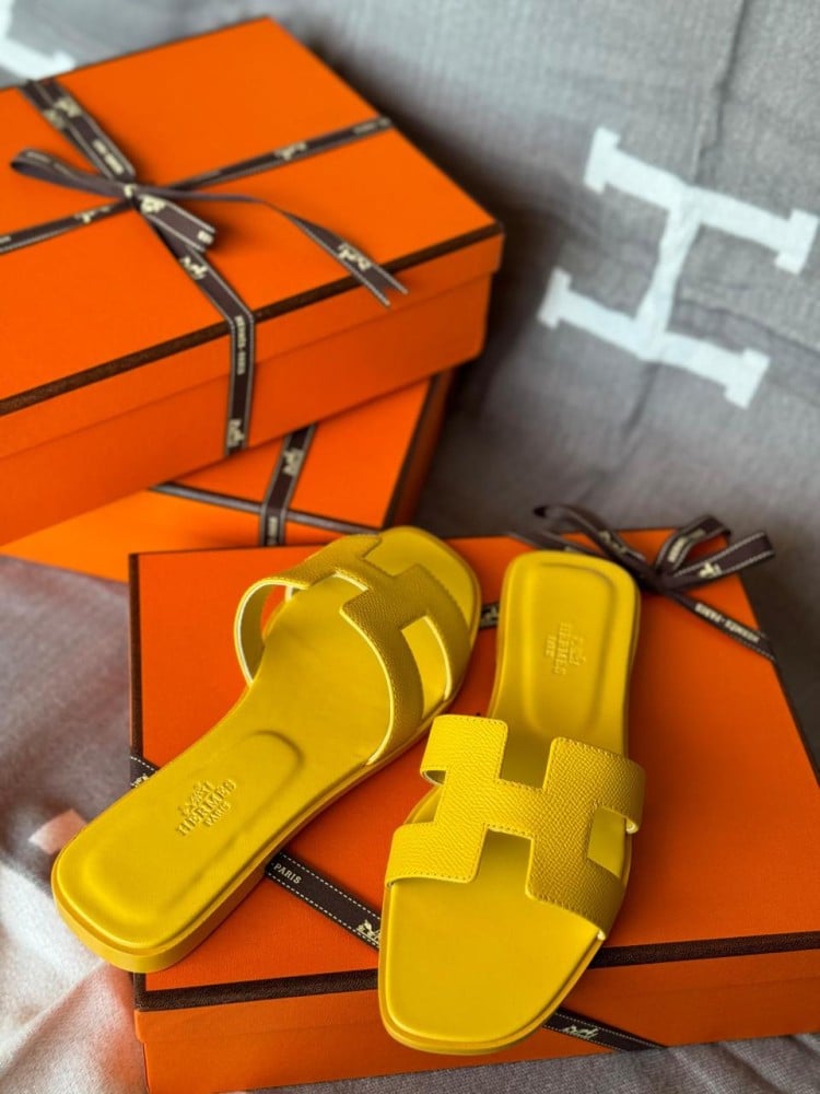 يأتي سليبير هيرميس أوران بجزء علوي فريد من الجلد بلون أصفر مشرق، مما يضفي لمعة إشراقة وحيوية على الحذاء. تصميم الحزام الأنيق والنعل الداخلي المبطن يضفيان للسليبر جاذبية فائقة وراحة لا مثيل لها.