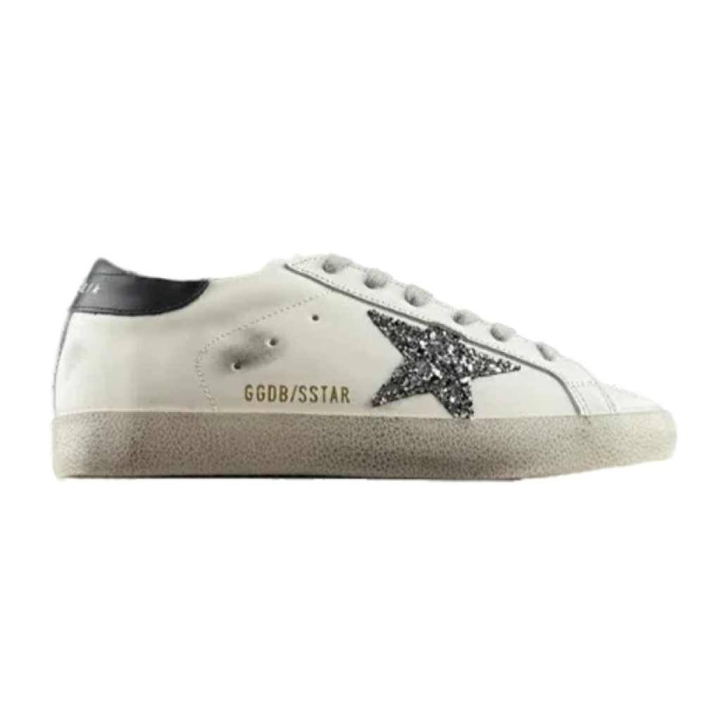 سنيكر نسائي جولدن جوس سوبر ستار يجمع بين اللون الأبيض الكلاسيكي مع تفاصيل بلاك جليتر تضيف لمسة ملفتة وجريئة