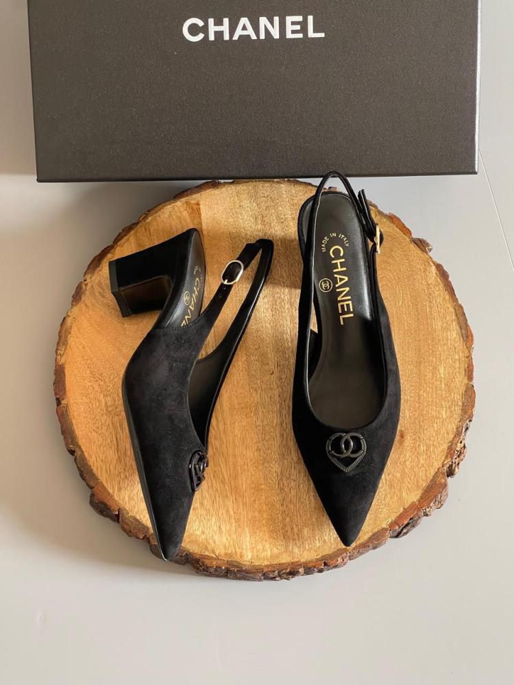حذاء نسائي بحزام خلفي شانيل شامواه لون اسود فخم