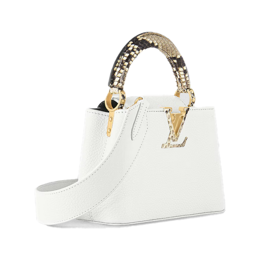 استمتعي بلمسة من الأناقة الفريدة والرفاهية المطلقة مع حقيبة كابوسين للنساء من لويس فيتون باللون الأبيض. تجمع هذه الحقيبة الرائعة بين التصميم الأنيق والتفاصيل الفاخرة، لتمنحك إطلالة لا مثيل لها.