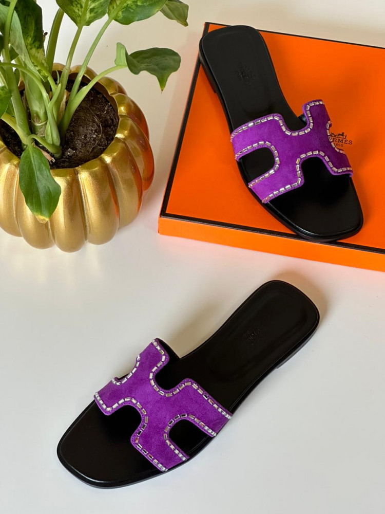 سليبر للسيدات فلات هيرميس Hermès Ooran باللون البنفسجي مع ستراس يمزج بين الرفاهية والأناقة بطريقة لا مثيل لها. يتميز هذا السليبر بتصميمه الجذاب ولونه البنفسجي الساحر، مع لمسات من الستراس التي تضفي لمعانًا فاخرًا.