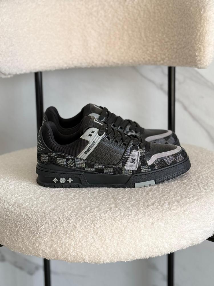 سنيكر LV Trainer من لويس فيتون يقدم مزيجاً أنيقاً من الجلد الفاخر والدينيم العصري، بلون أسود جريء يناسب الإطلالات اليومية والرياضية.
