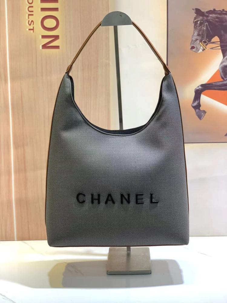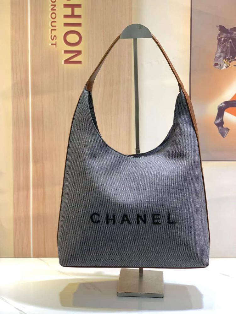 شنطة قماش شانيل توت باق لون رمادي داكن وبني