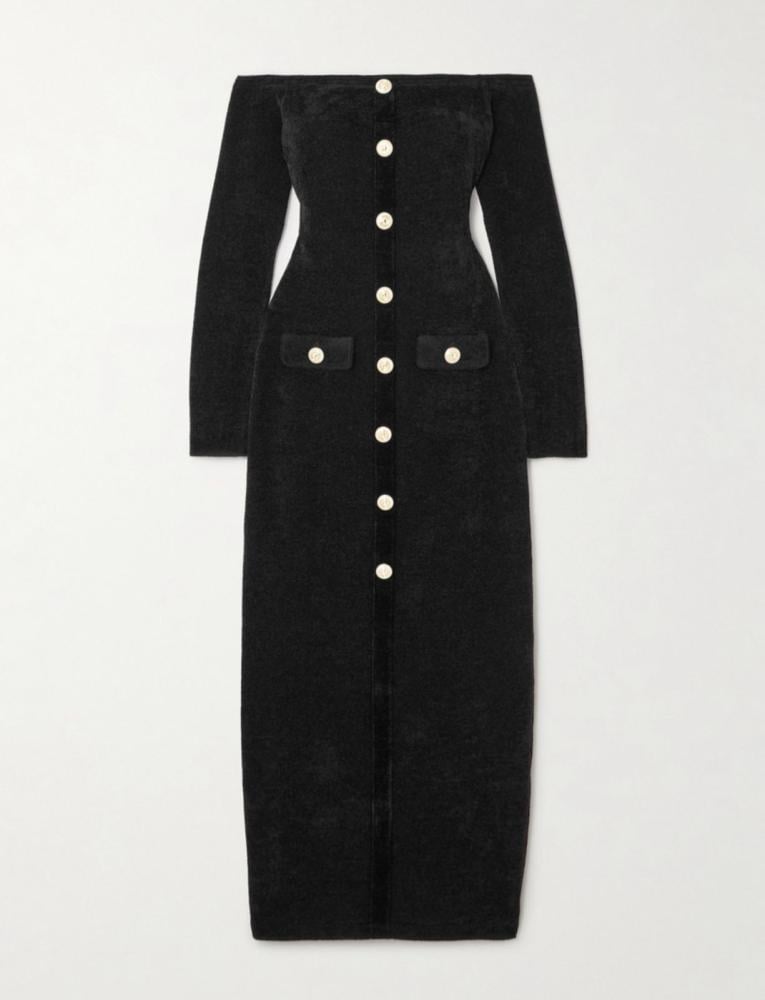 فخامة تلامس الأنوثة الراقية وتكشف عن حضور استثنائي، يتجسّد في فستان مكاسي سيلف بورتيه المحبوك بأكتاف مكشوفة باللون الأسود من متجر Eseven store.