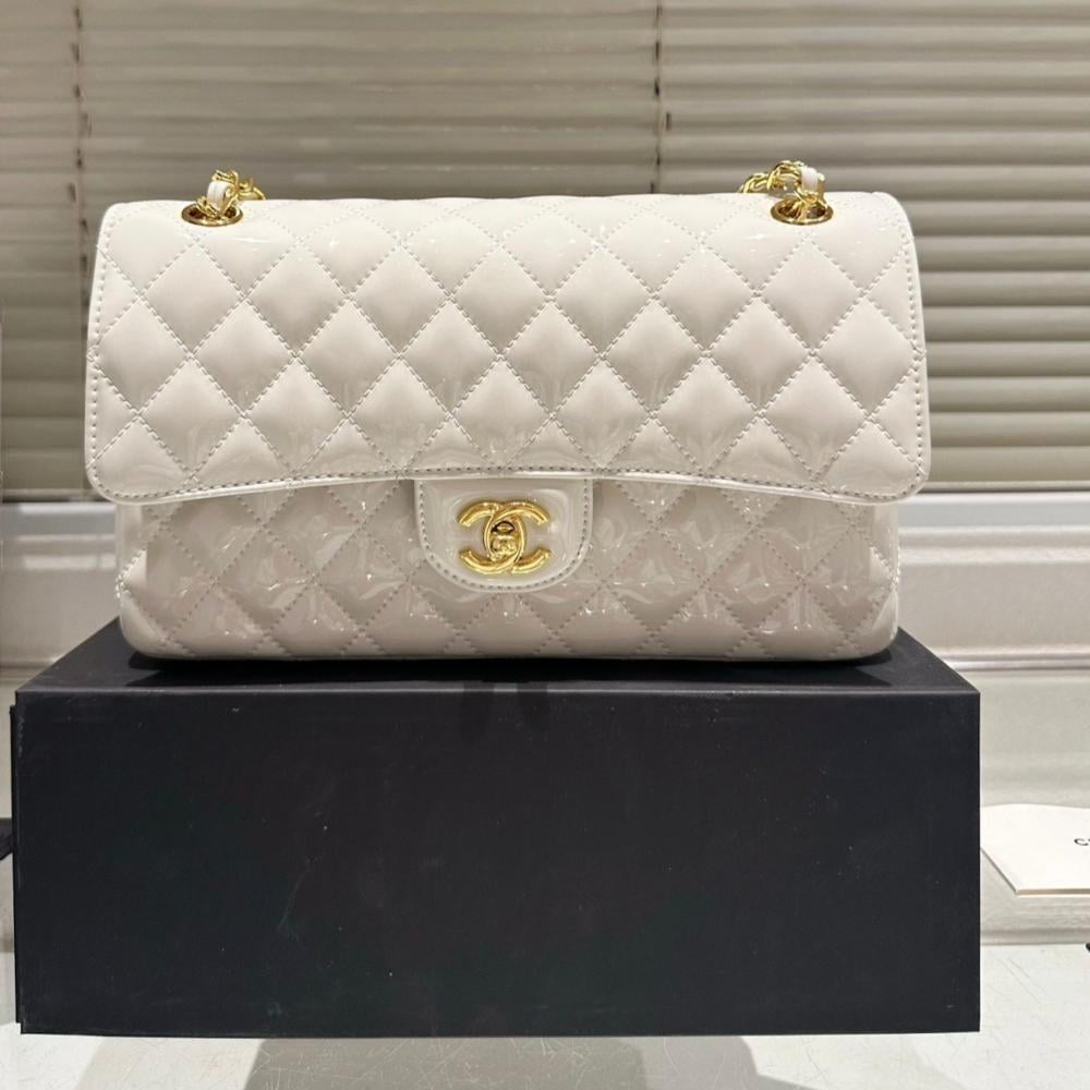 شنطة لامعة عصرية شانيل قلاب جلد لون أبيض معدن ذهبي