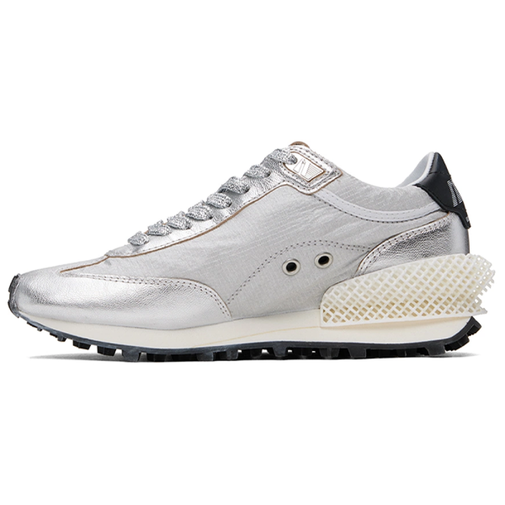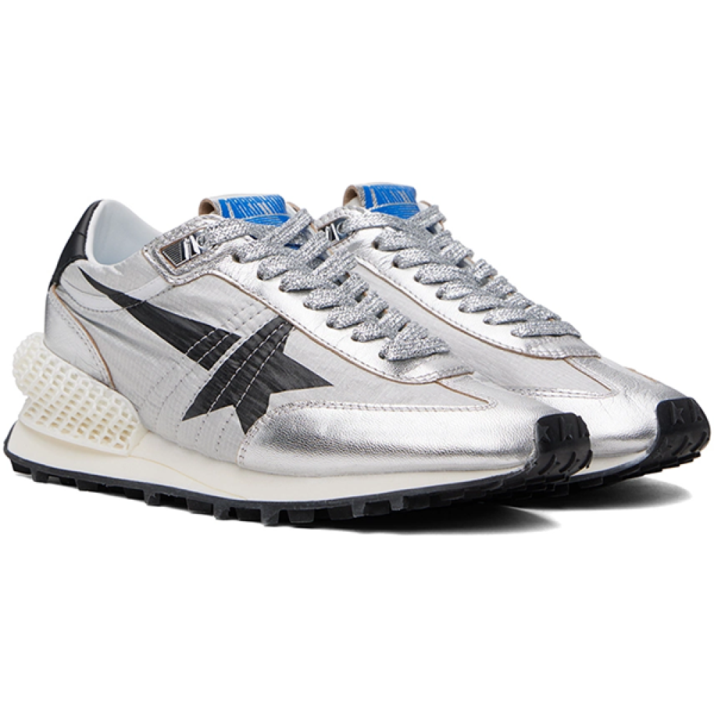سنيكر السباق جولدن جوس ماراثون بلون سيلفر وأسود، تصميم يجمع بين السرعة والأناقة في كل خطوة.