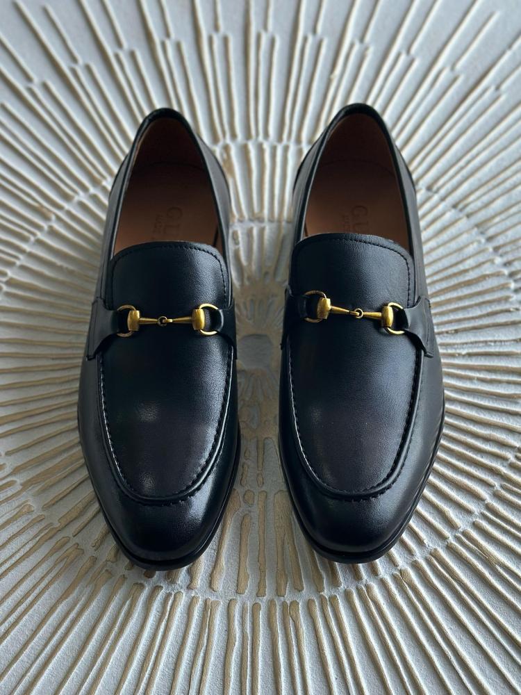 الحذاء الرسمي الأسود من قوتشي للرجال، بتصميم سادة راقٍ وتفصيل معدني ذهبي يضيف لمسة من الفخامة.