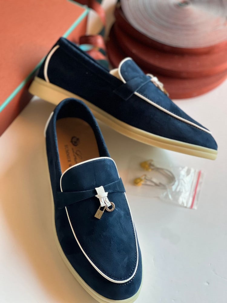 انتعشي بأناقة وراحة لا مثيل لهما مع حذاء "موكسان لورو بيانا" النسائي بلونه الكحلي وتفاصيله البيضاء الفاخرة. صُنع هذا الحذاء الفلات من أجود أنواع الشامواه، مما يضمن لكِ متانة وراحة استثنائيتين.