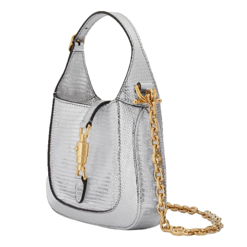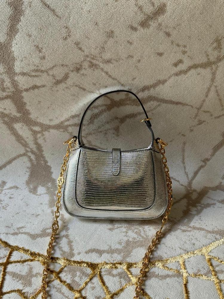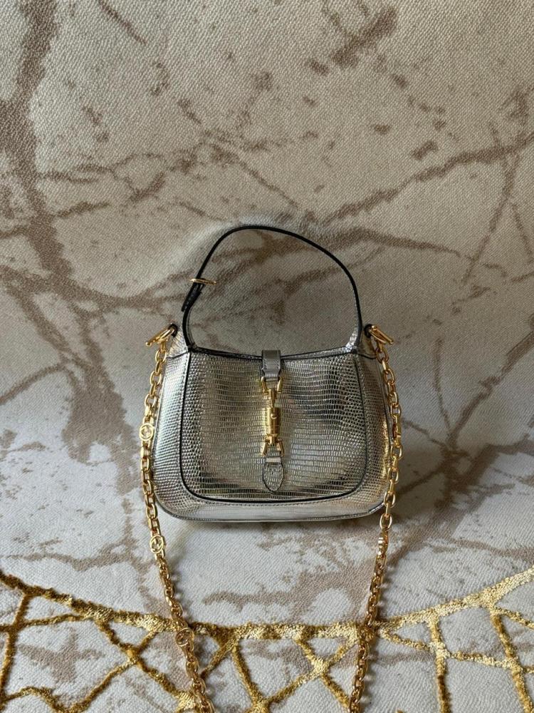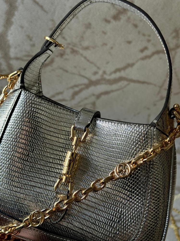استعدي لتحطمي حدود الأناقة مع حقيبة جوتشي جاكي الجلدية بالسحاب، بحجم 19 سم وبلون فضي ساحر!