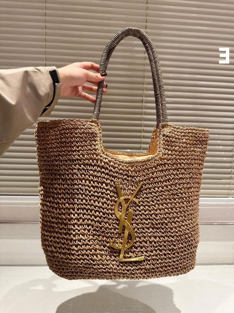 شنطة محبوكة سان لوران بلون القش الداكن لوجو ذهبي