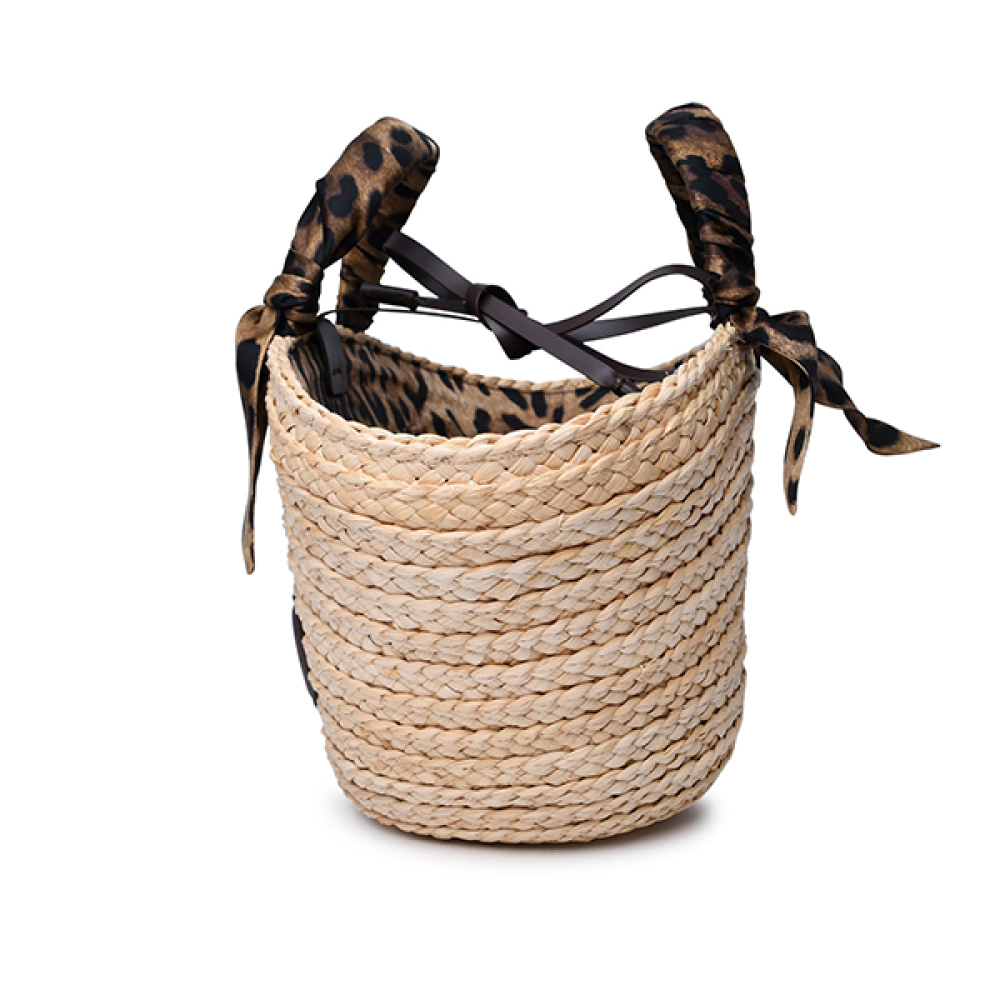 استمتعي بالأناقة الصيفية مع حقيبة كيندرا من دولتشي اند غابانا، المصنوعة من القش الطبيعي ومزينة بشعار أسود يضفي عليها لمسة من الأناقة والأنوثة.