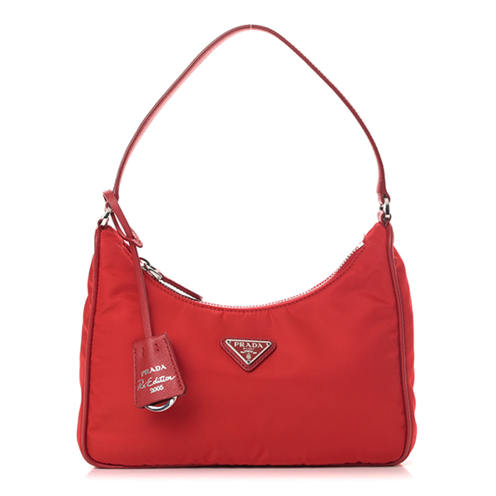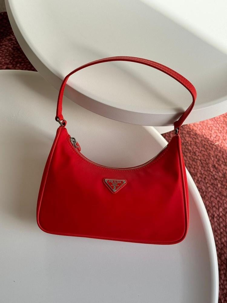 حقيبة برادا سافيانو Re-Edition بلون أحمر جريء، تأتي بحجم 23 سم مثالية لإضافة لمسة من الفخامة إلى إطلالتك اليومية.
