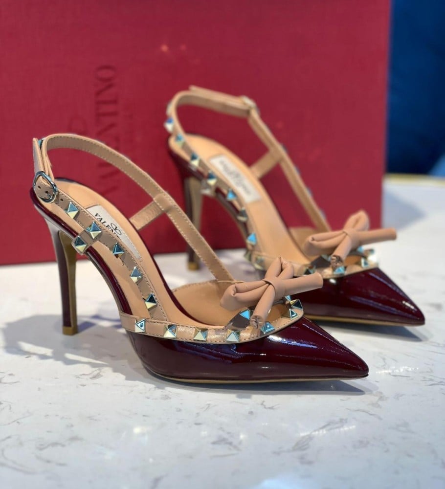 تألقي بأناقة لا مثيل لها مع صندل فالنتينو روكستد بو بكعبه الرفيع واللون الخمري الساحر.