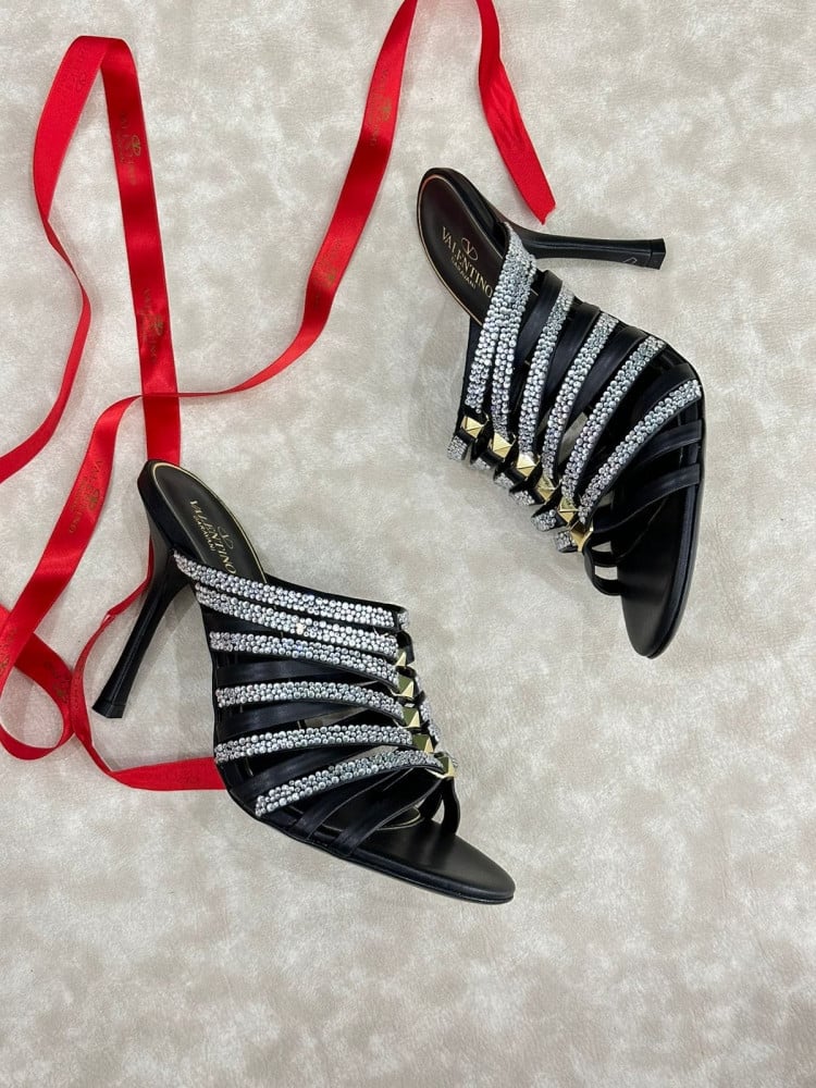 صندل كعب عالي فالنتينو أسود مع ستراس فضي وأحجار ذهبية