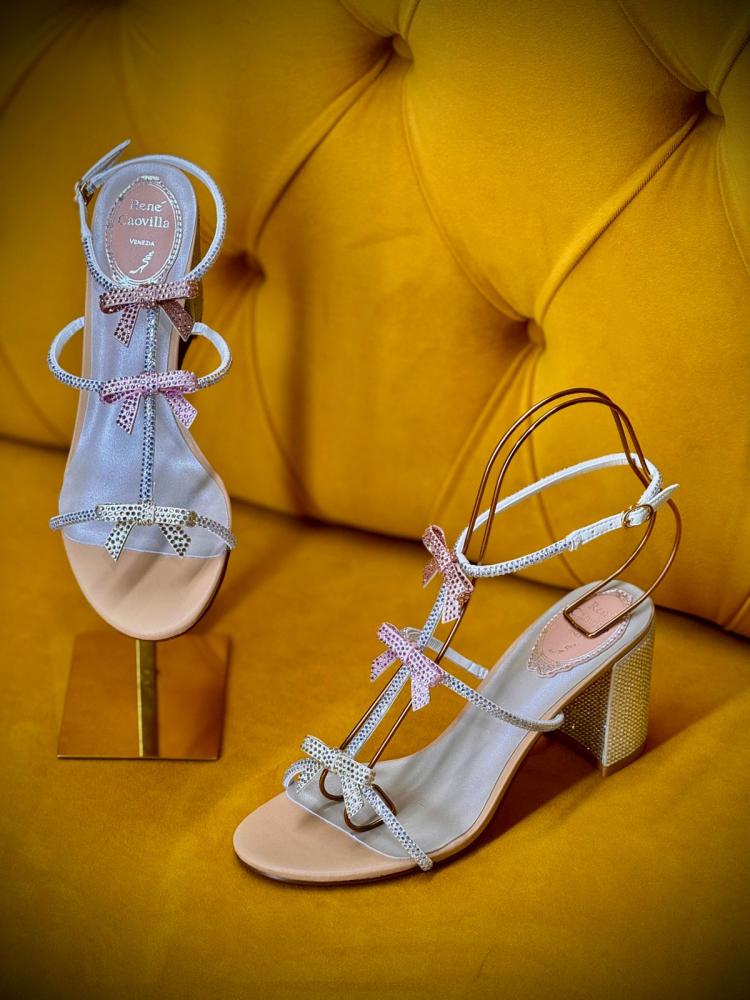 صندل سهرات رينيه كوفيلا كاترينا بلونه الفضي ولمسة الفيونكات الوردية – عيشي الفخامة والراحة في كل خطوة كأنك تمشين على الغيم.