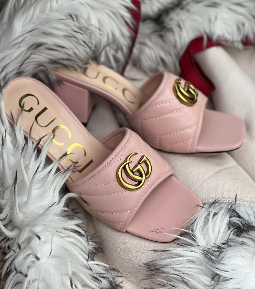 - صندل جوتشي بكعب عالي يتميز بتصميمات أنيقة وفخمة تعكس الأناقة والفخامة التي تميز العلامة التجارية.