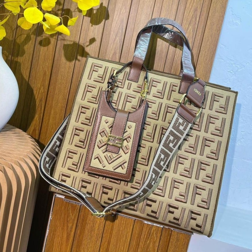 حقيبة فيندي الكبيرة بتصميمها الأنيق والعملي تجسد الفخامة بأسلوبها الخاص. تتميز بنقشة العلامة التجارية الأيقونية المطبوعة بطريقة جذابة وبارزة على القماش.