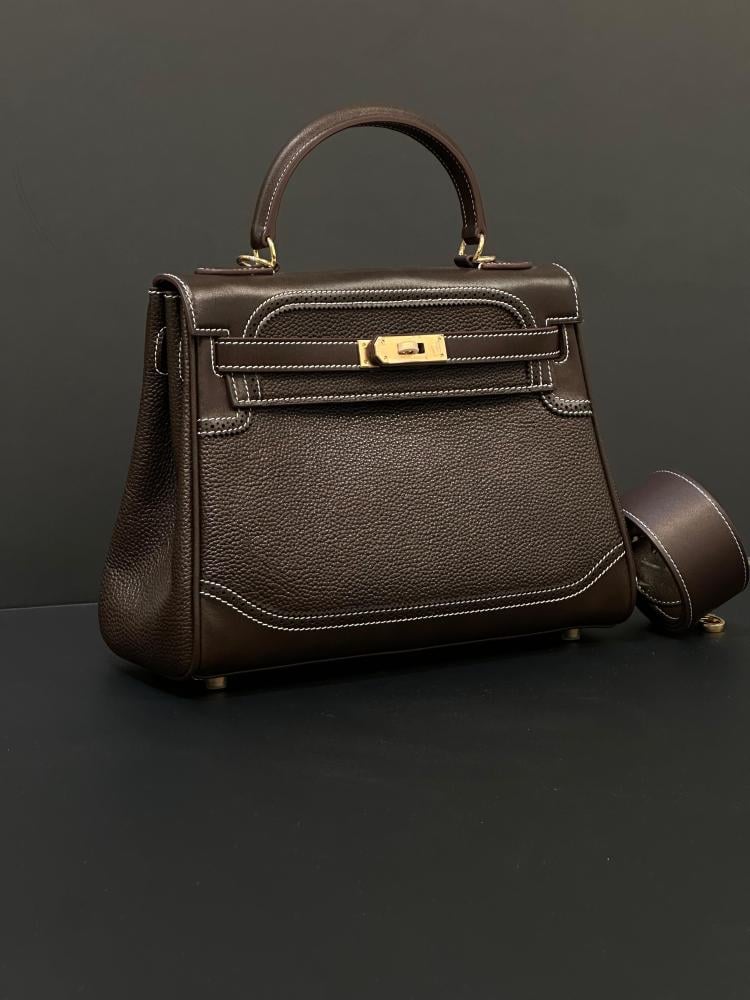 تألقي بحقيبة تعكس قمة الفخامة والذوق الرفيع مع هيرميس كيلي 28 سم، المصنوعة من الجلد الأسود الفاخر مع تطريز ناعم وحامل كتف أنيق: