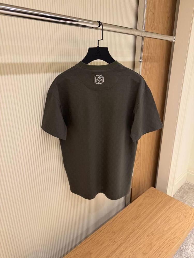 تيشيرت رجالي من لويس فيتون بلون زيتي أنيق، مطرّز بشعار الماركة بأسلوب بارز يضيف لمسة فاخرة إلى التصميم البسيط.