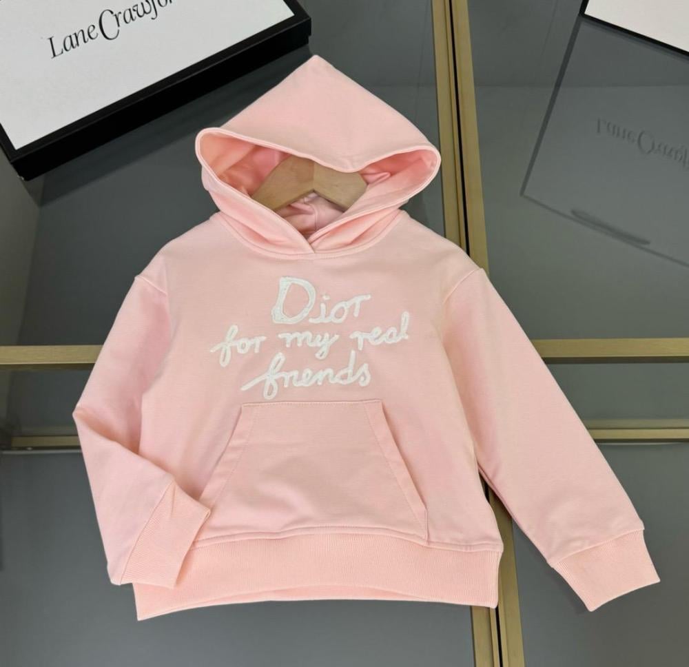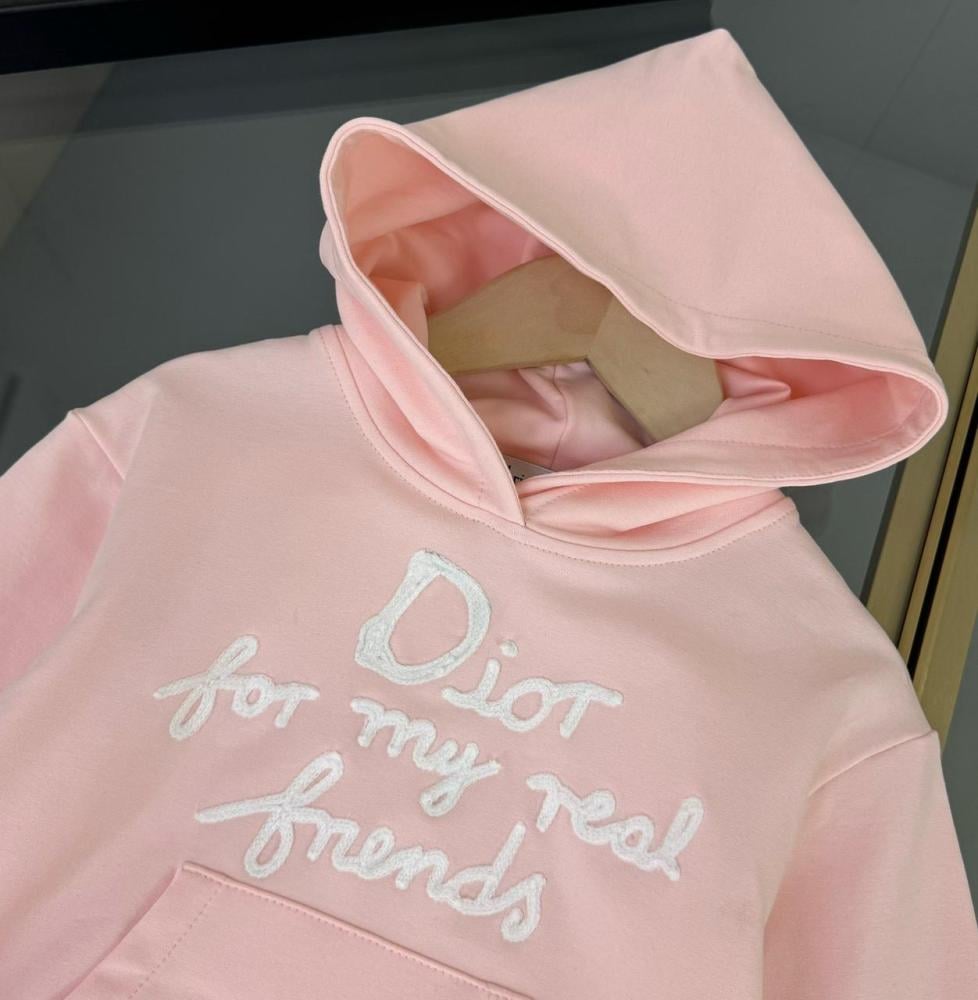 طقم هودي وبنطال زهري من ديور مصمّم ليجمع بين أناقة الديزاين العالمي وراحة يومية تناسب حركة البنات طوال اليوم. كلمة "Dior for my real friends" مطرَّزة بعناية على الخامة لتعطي لمسة فخمة من دون تضحية بالعملية، لون زهري مبهج ينعش خزنة ملابسها ويخليها محطّ الأنظار في الروضة أو البيت.