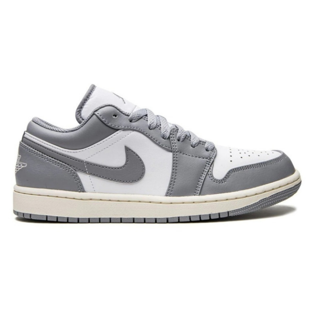 يتميز Air Jordan 1 Low بتصميمه ذو اللونين. يأتي هذا الزوج باللون الرمادي الفاتح والأبيض ، وهنا ، تم استبدال العلامة التجارية "NIKE AIR" على اللسان بشعارات Jumpman