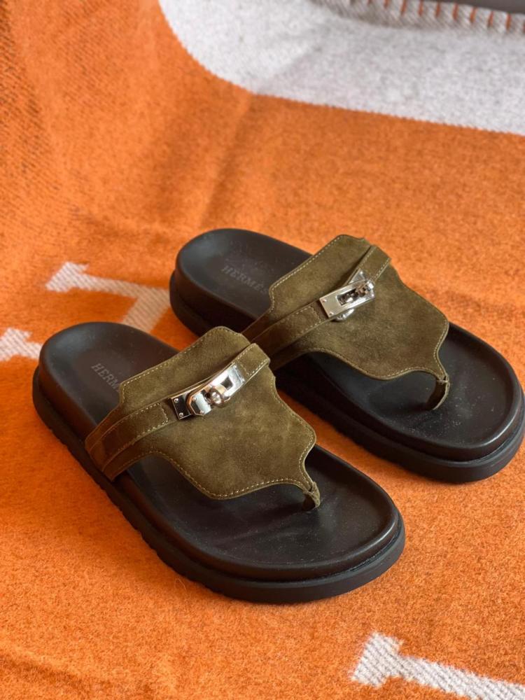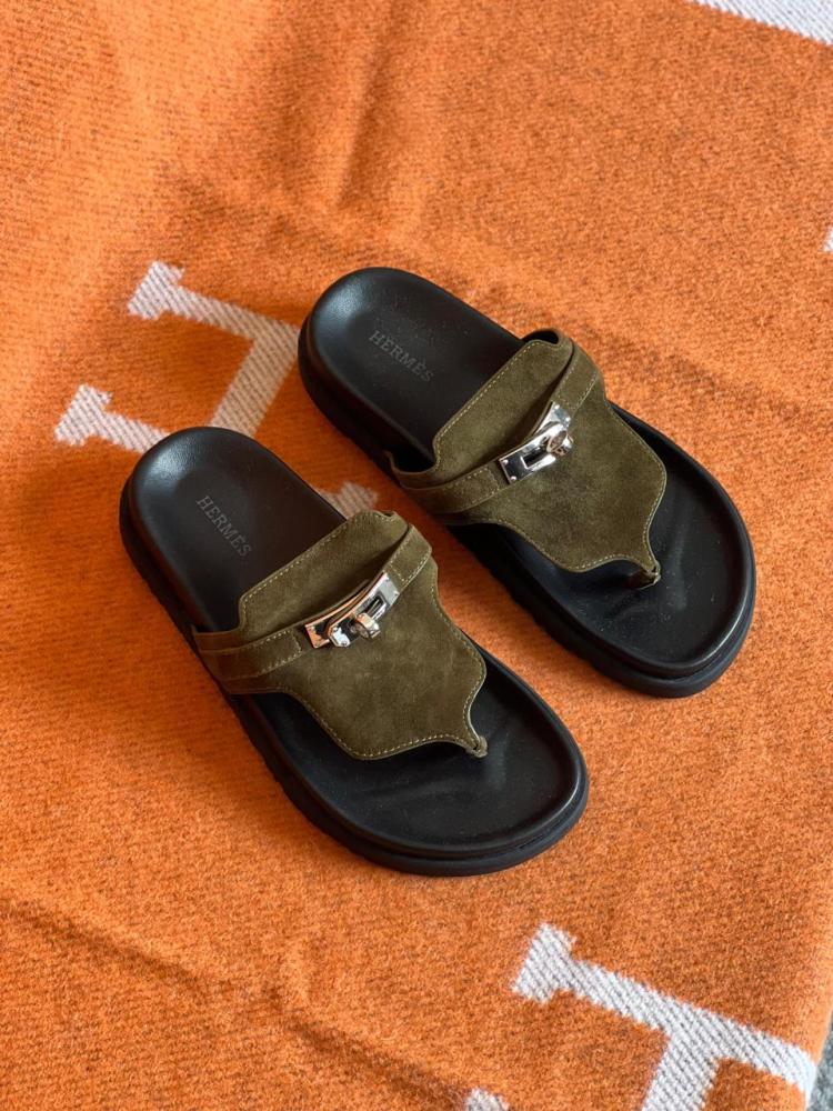 صندل هيرميس الفلات بأصبع باللون الزيتي المصنوع من جلد الشامواه هو الخيار المثالي للمرأة التي تبحث عن إطلالة فاخرة ومريحة في نفس الوقت.